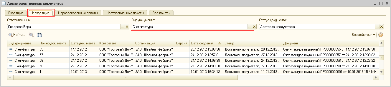 На закладках "Исходящие" ("Входящие") списка "Архив электронных документов" можно отсортировать документы или отобрать отправленные (полученные) документы по ответственному лицу, виду и статусу документа (рис. 14).