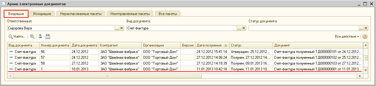 На закладке "Входящие" ("Исходящие") списка "Архив электронных документов" можно отсортировать документы или отобрать полученные (отправленные) документы по ответственному лицу, виду и статусу документа (рис. 13).