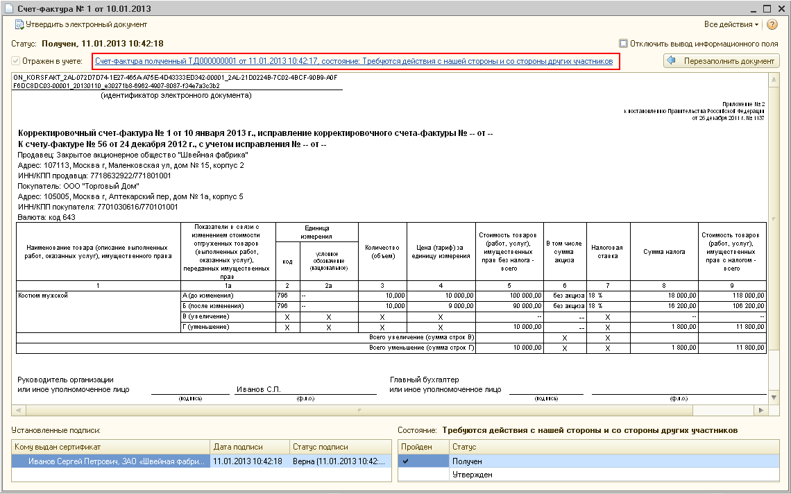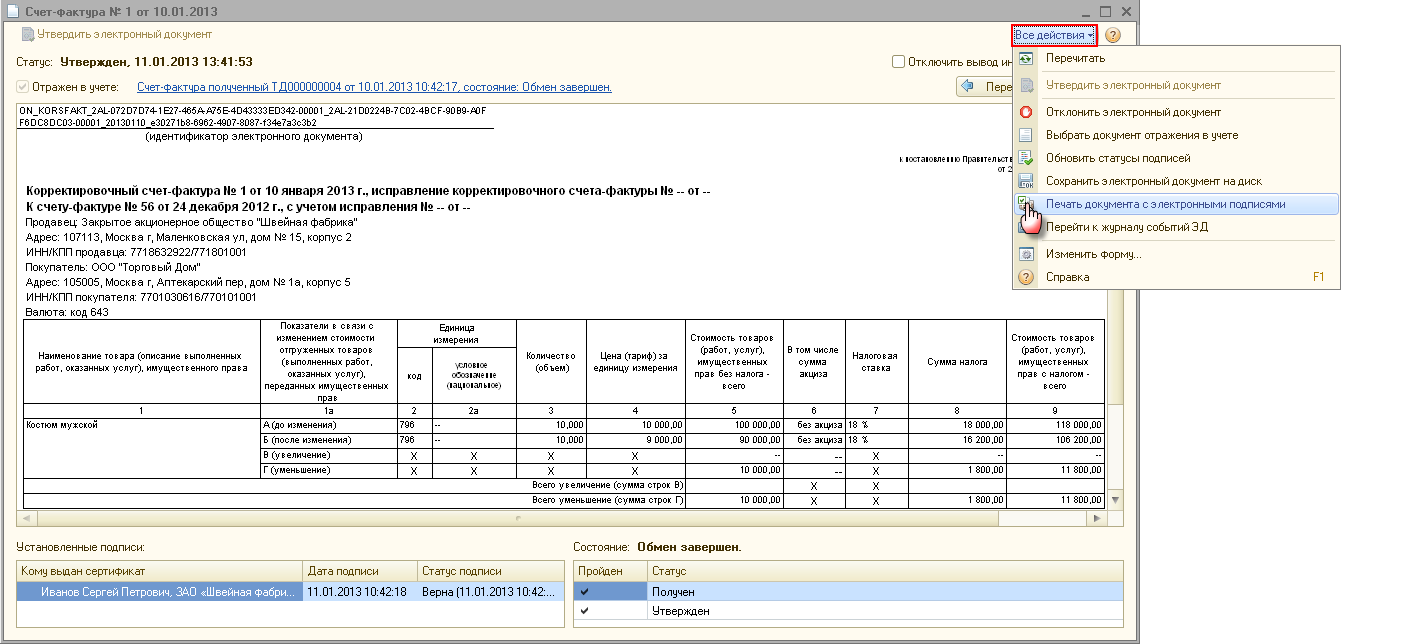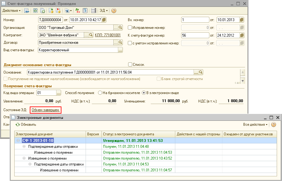 На этом обмен корректировочным электронным счетом-фактурой у покупателя завершается (рис. 11).