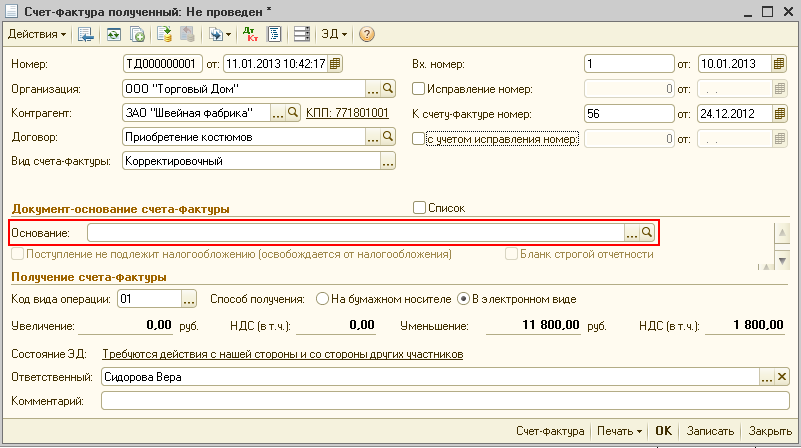 При этом в новом документе "Счет-фактура полученный" необходимо заполнить поле "Основание", указав в нем соответствующий документ учетной системы "Корректировка поступления" с видом операции "Корректировка по согласованию сторон".