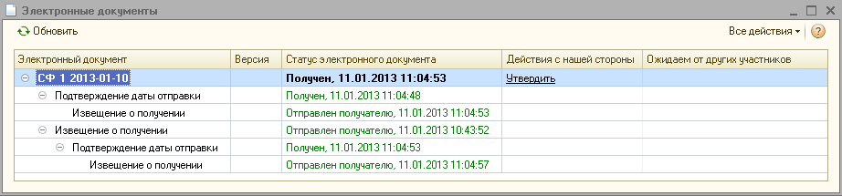 Подробную информацию о том, какие действия необходимо выполнить покупателю со своей стороны в отношении поступившего документа, а также о требуемых действиях со стороны других участников обмена, можно увидеть в форме Электронные документы (Таблица состояния) (рис. 5), которая открывается:
