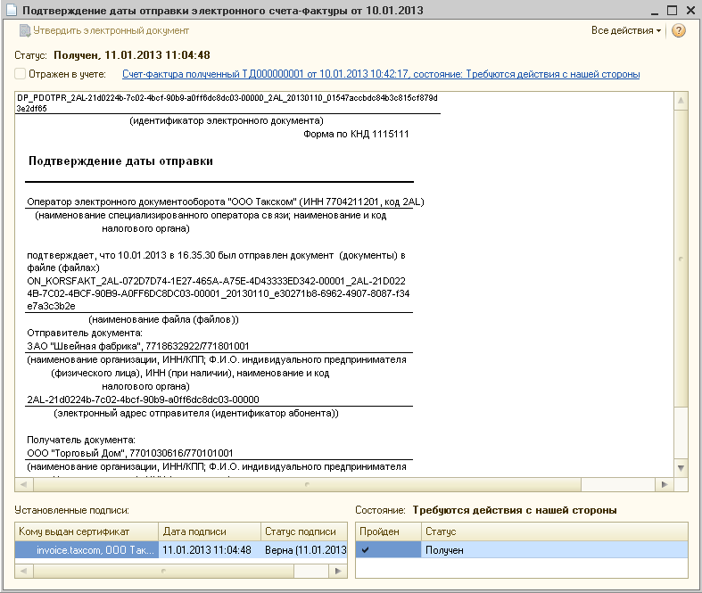 - После получения подтверждения оператора ЭДО - извещение оператору о получении подтверждения (п. 2.12 Порядка выставления и получения счетов-фактур в электронном виде по телекоммуникационным каналам связи с применением электронной цифровой подписи).
