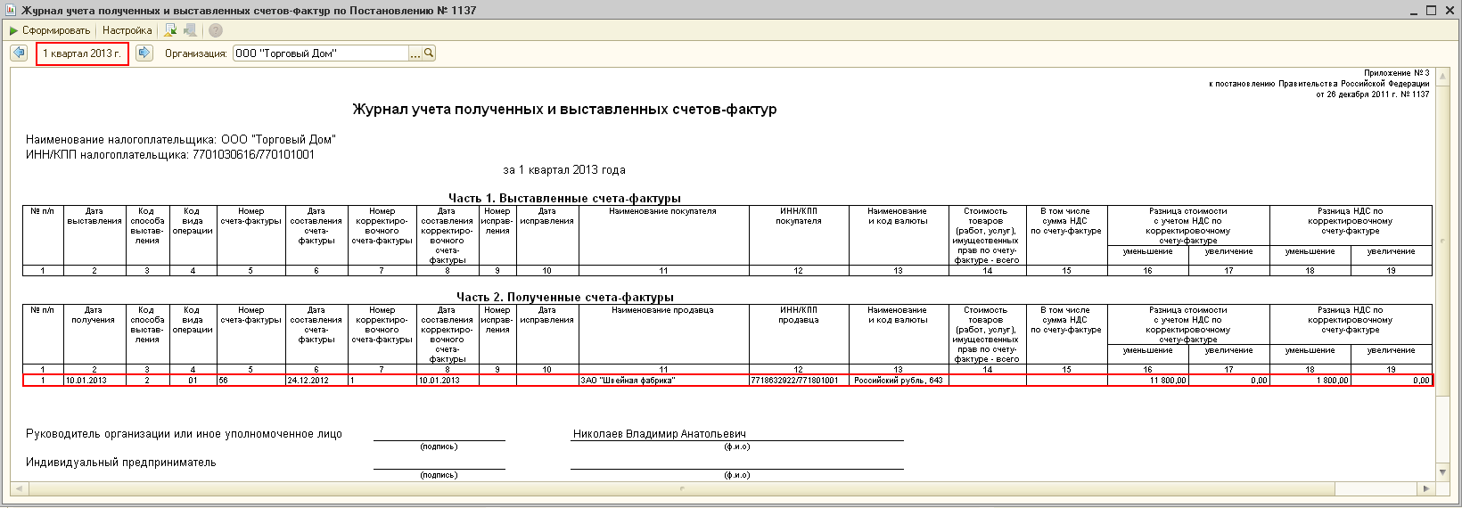 После отправки продавцу извещения о получении счета-фактуры поступивший корректировочный счет-фактура будет зарегистрирован в части 2 журнала учета полученных и выставленных счетов-фактур (пп. "б" п. 11 Правил ведения журнала учета полученных и выставленных счетов-фактур, утв. Постановлением № 1137) (рис. 8).