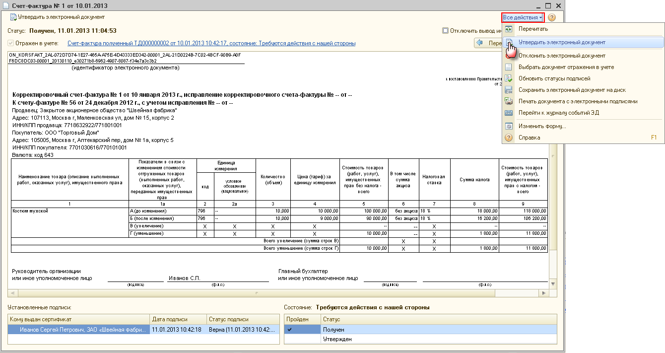 Если претензий к полученному корректировочному электронному счету-фактуре нет, то его нужно утвердить, выполнив: