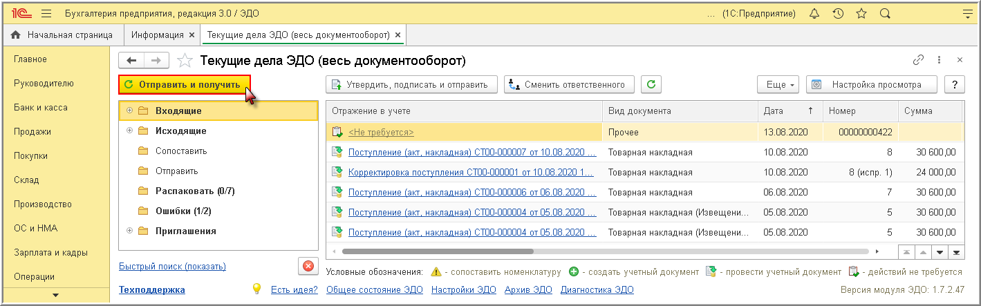 - по команде Отправить и получить из формы списка документов "Текущие дела ЭДО", открываемого по гиперссылка панели команд Текущие дела ЭДО (раздел Администрирование - подраздел Сервис или раздел Руководителю - подраздел Сервис, или раздел Продажи - подраздел Сервис) (рис. 1).