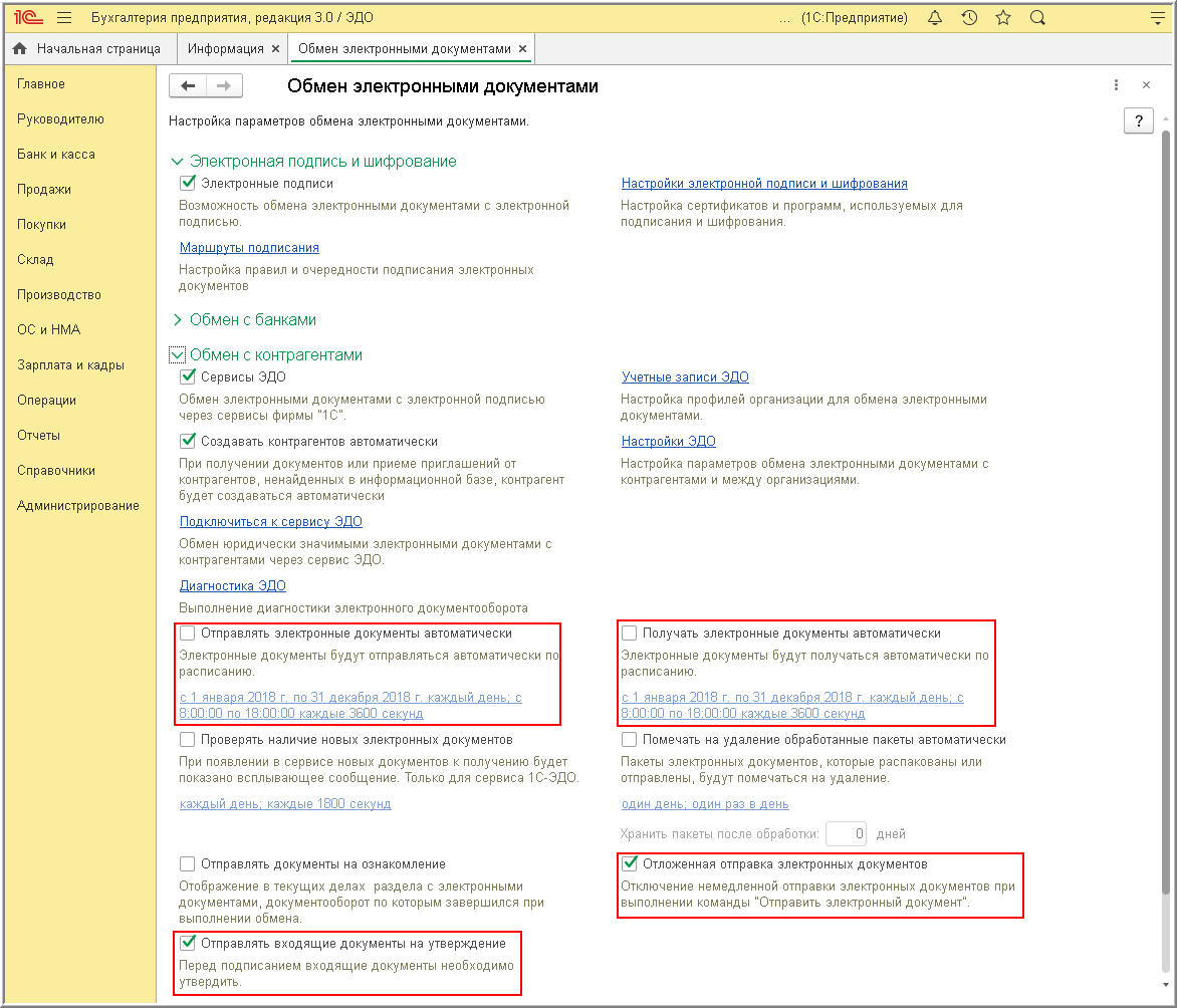 При работе информационной базы в режиме клиент-сервер можно установить расписание автоматической отправки электронных документов, выполнив соответствующую настройку параметров обмена электронными документами с контрагентами (раздел Администрирование - Обмен электронными документами - Обмен с контрагентами) (рис. 2).