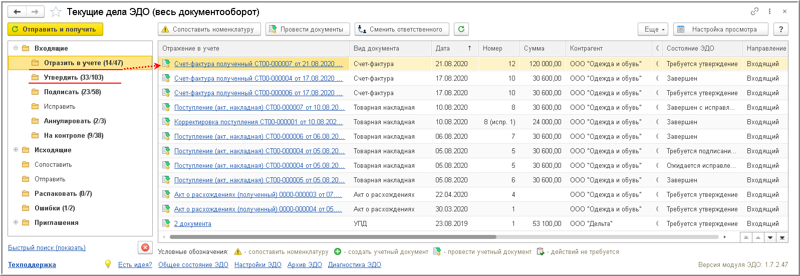 - по гиперссылки в графе "Отражение в учете" активной строки из списка "Текущие дела ЭДО" (рис. 3);