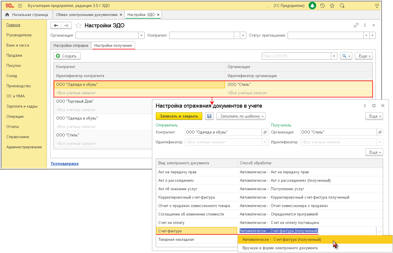 Для настройки отражения поступающих электронных документов в учетной системе из формы "Настройки ЭДО" (раздел Администрирование - Обмен электронными документами - Обмен с контрагентами - Настройки ЭДО), находясь на закладке "Настройки получения" и дважды щелкнув по строке, отражающей ЭДО с конкретным контрагентом, необходимо перейти в форму "Настройка отражения документов в учете" и установить способ обработки поступающих электронных документов: "Автоматически" или "Вручную в форме электронного документа" (рис. 4).