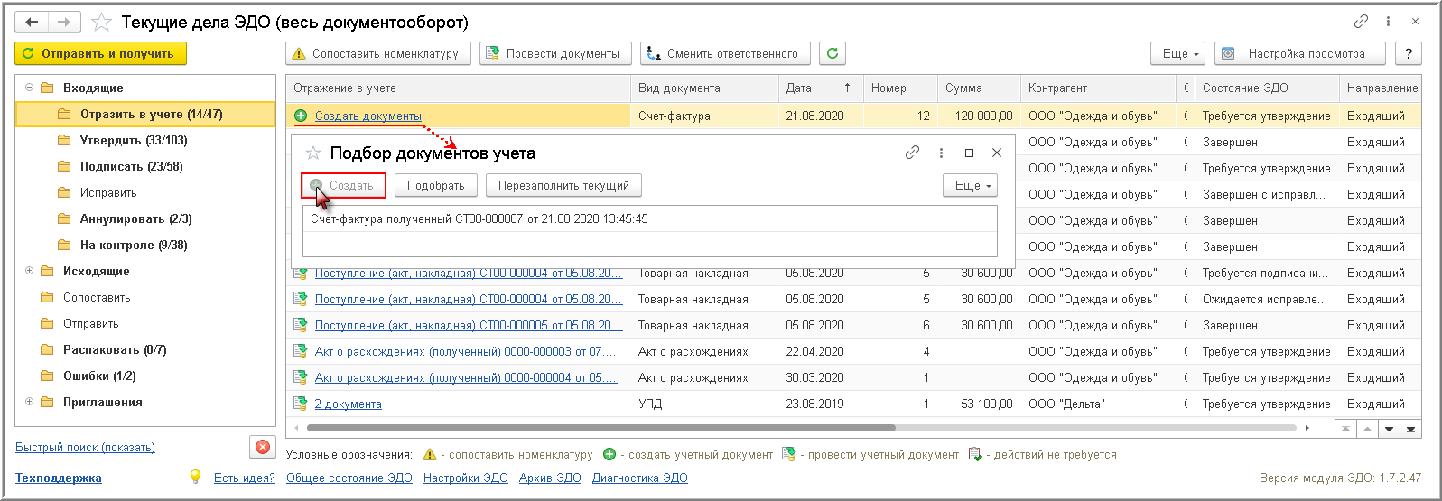 Поступивший электронный авансовый счет-фактура помещается в папку "Отразить в учете" списка входящих документов формы "Текущие дела ЭДО" (рис. 3).