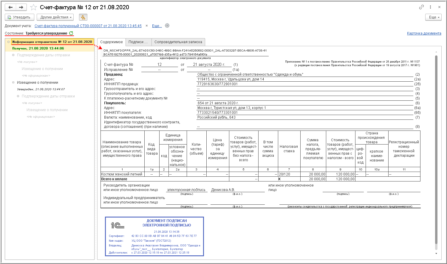 - в информационной строке состояния формы просмотра поступившего электронного счета-фактуры. При установке в настройках обмена флажка для значения "Отправлять входящие документы на утверждение" (рис. 2) будет установлено значение Требуется утверждение (рис. 6);