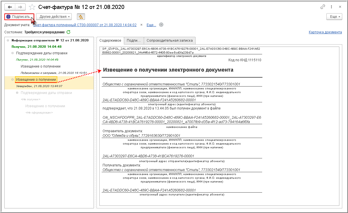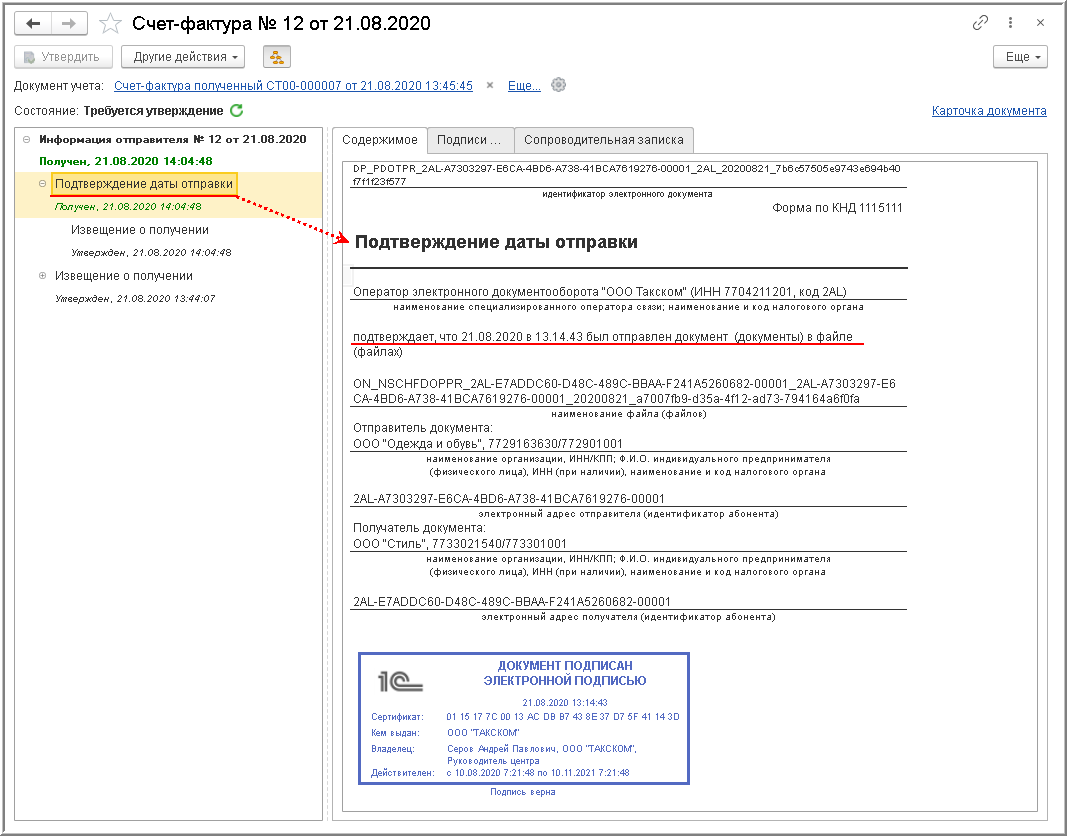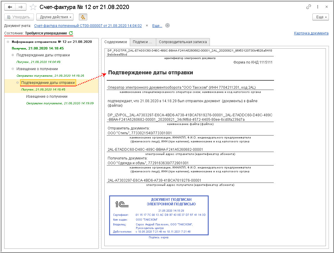 Процедура утверждения поступившего электронного счета-фактуры Порядком обмена не предусмотрена, однако она важна для внутреннего контроля за достоверностью поступившего электронного документа.