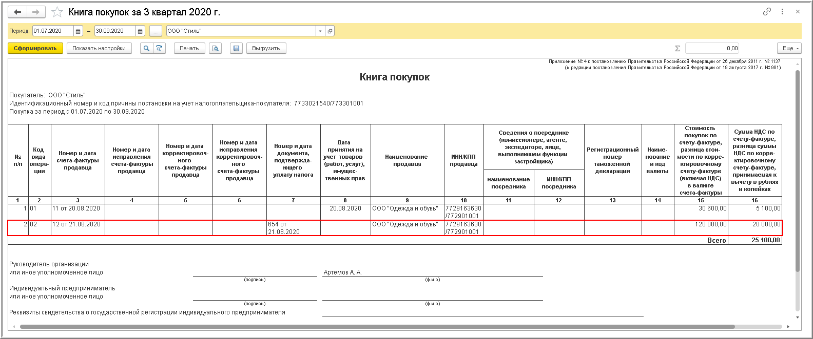 Если полученный счет-фактура служит основанием для заявления налогового вычета по НДС, и в поле "Отразить вычет НДС в книге покупок датой получения" проставлен флажок (рис. 7), то поступивший ЭСФ будет зарегистрирован в книге покупок налогового периода его получения (п. 1.1 ст. 172 НК РФ, п. 2 Правил ведения книги покупок, утв. Постановлением № 1137) (рис. 9).