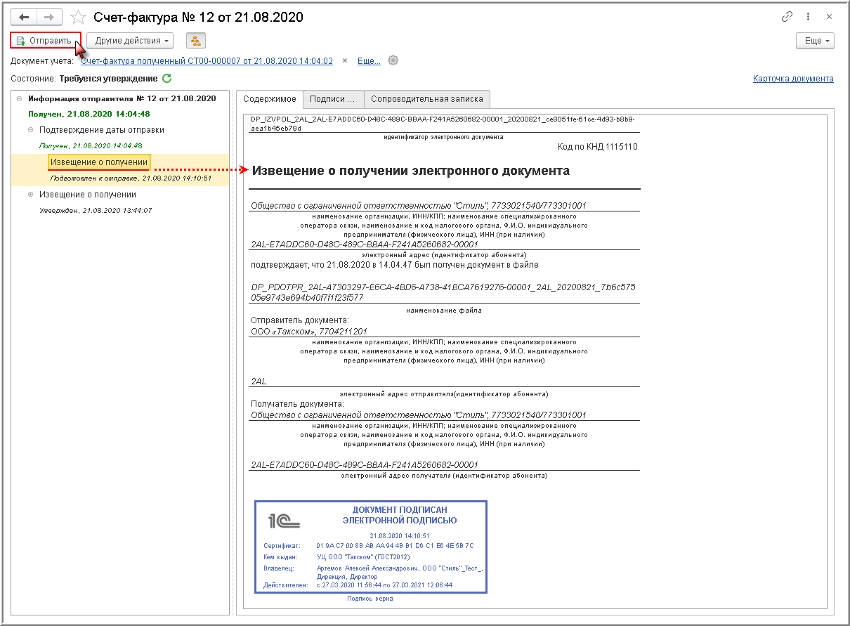 - Сформировать и отправить извещение продавцу о получении счета-фактуры (если предусмотрено)