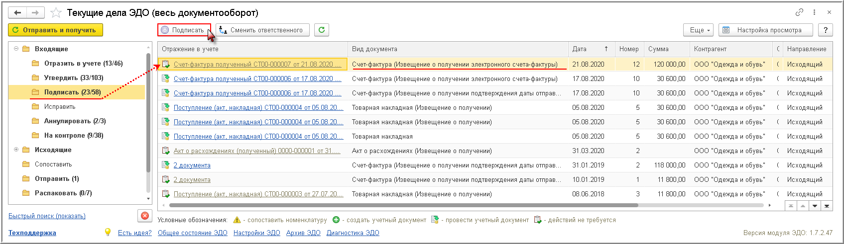 Подписать сформированные электронные извещения можно по кнопке Подписать (или Подписать и отправить, если не установлена отложенная отправки электронных документов, о чем будет написано далее) из папки "Подписать" списка "Текущие дела ЭДО", открываемого по гиперссылке Текущие дела ЭДО (раздел Администрирование - подраздел Сервис или раздел Руководителю - подраздел Сервис, или раздел Продажи - подраздел Сервис) (рис. 12).