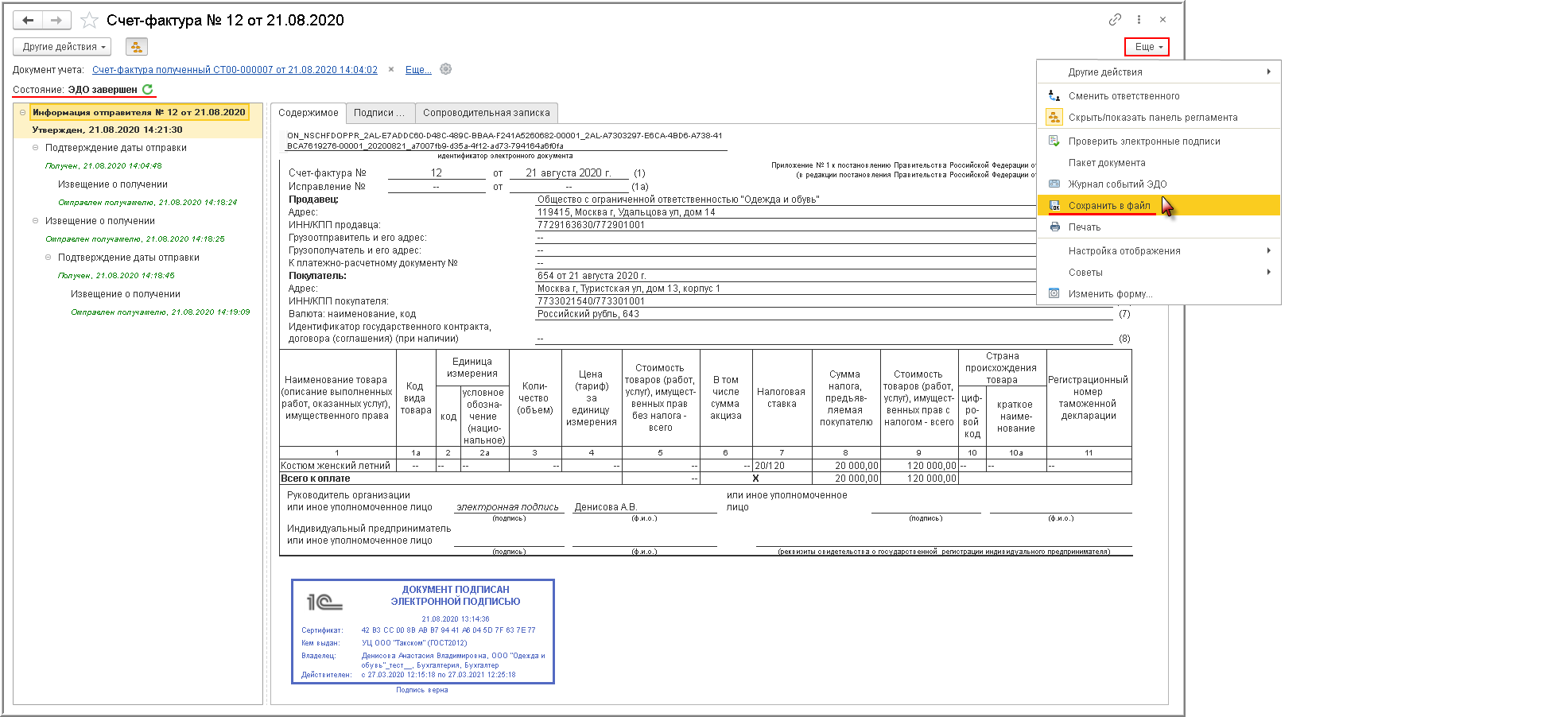 Также из формы просмотра, вызвав команду Сохранить в файл из списка доступных команд, открываемого по кнопке Еще, можно сохранить электронный счет-фактуру вместе с электронной подписью.
