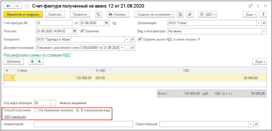 В информационной строке состояния электронного обмена документа "Счет-фактура полученный", где будет установлено значение ЭДО завершен (рис. 15).