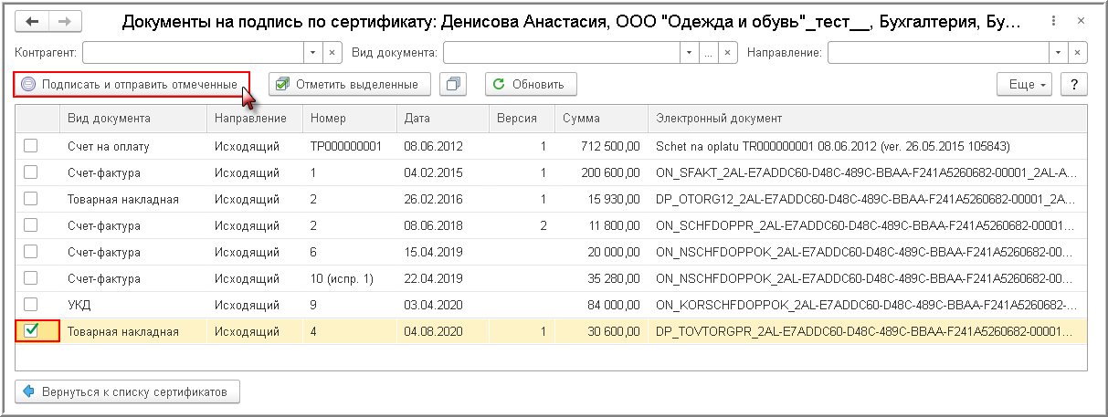 Кроме того, подписание сформированных электронных документов лицом, имеющим право электронной подписи, можно произвести из формы "Документы на подпись", в которой указываются сведения о доступном сертификате (доступных сертификатах) (раздел Администрирование - подраздел Электронные документы - Документы на подпись или раздел Руководителю - подраздел Электронные документы - Документы на подпись). Сформированные электронные документы, отмеченные флажком, подписываются при выполнении команды Подписать и отправить отмеченные.