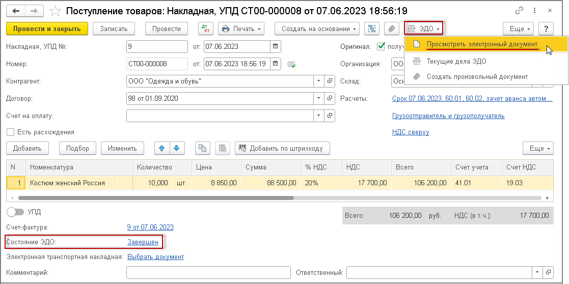 Открыть для просмотра электронный документ можно из документа учетной системы "Поступление (акт, накладная, УПД)" (рис. 1):