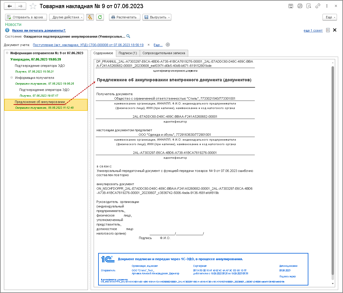Если электронный первичный учетный документ составлен (т.е. сформирован и подписан обеими сторонами) ошибочно, то для лишения этого документа юридической значимости необходимо провести процедуру его аннулирования.