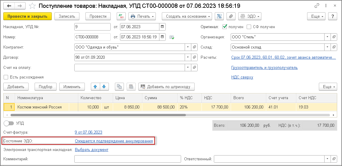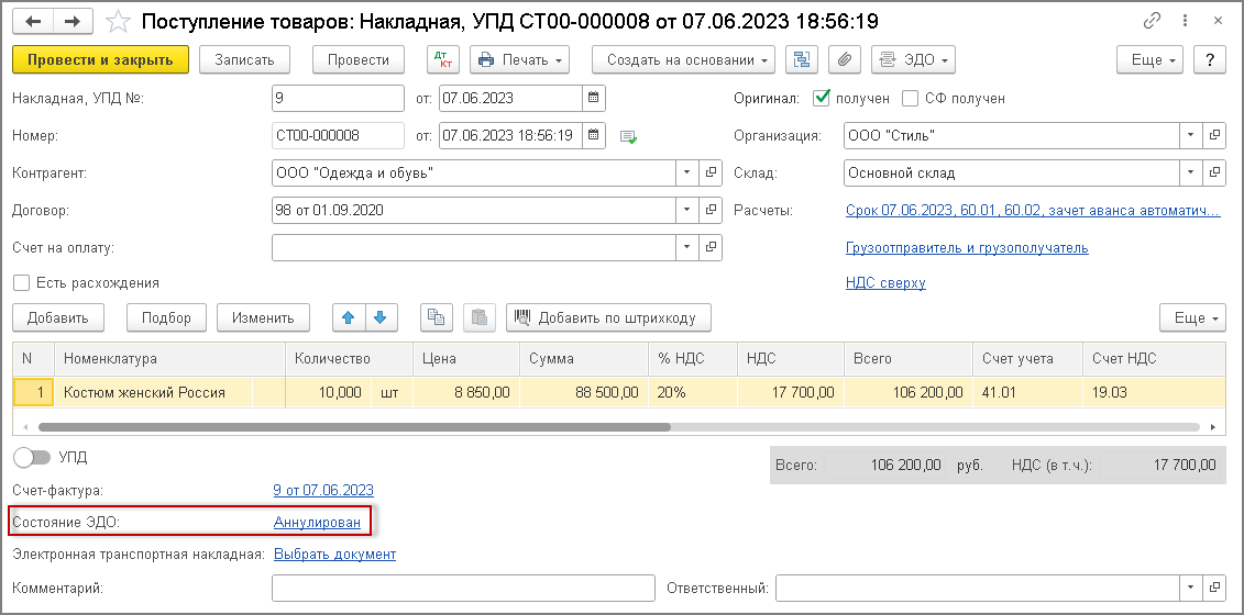 В информационной строке "Состояние ЭДО" документа учетной системы "Поступление (акт, накладная, УПД)" появится гиперссылка Аннулирован (рис. 7).