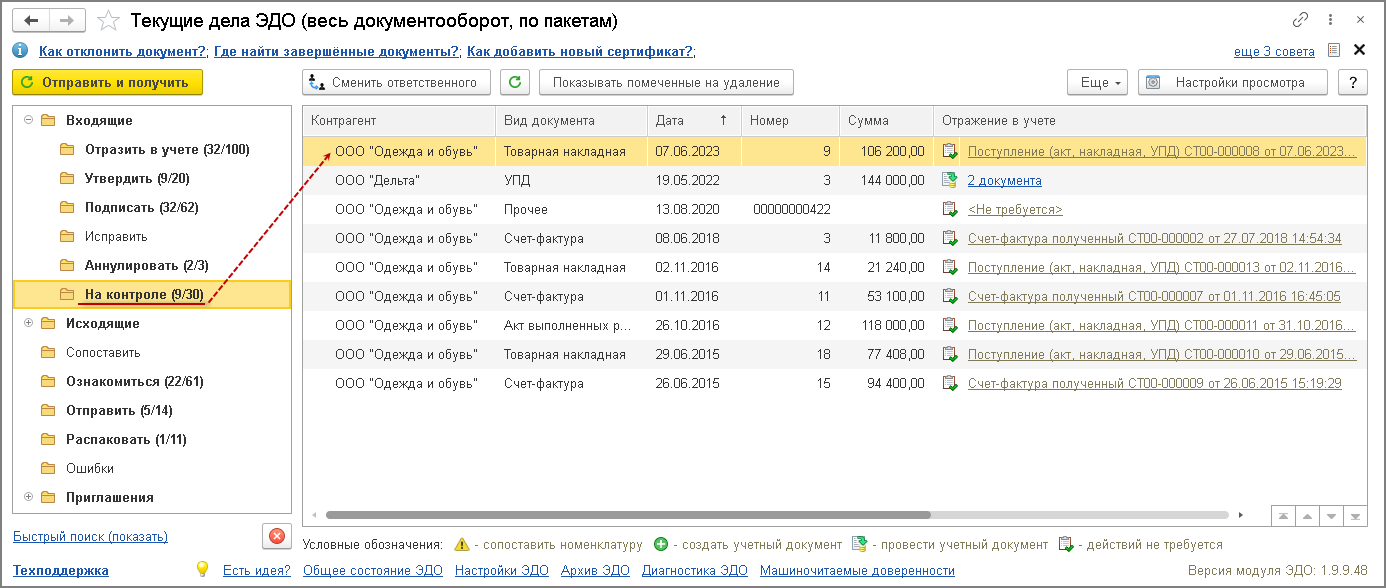 В форме списка документов "Текущие дела ЭДО" электронный документ (УПД(ДОП)), по которому сформировано предложение об аннулировании, будет перемещен в папку "На контроле" списка входящих документов (рис. 6).