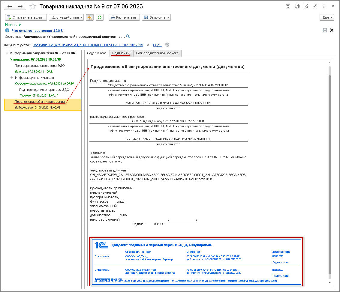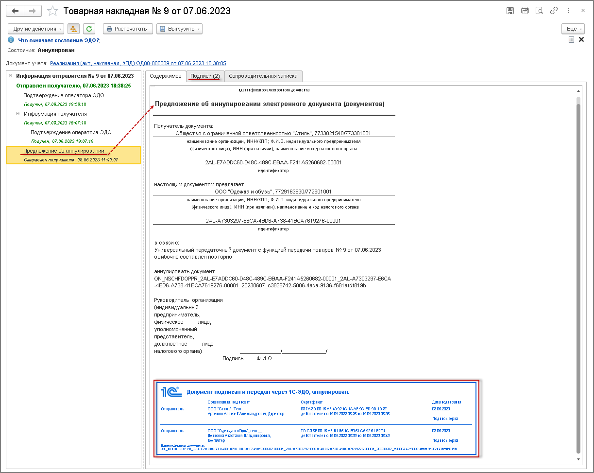 В режиме просмотра документа "Предложение об аннулировании электронного документа (документов)" можно удостовериться во взаимном согласии сторон на аннулирование, так как данный документ будет содержать подписи обеих сторон (рис. 8).