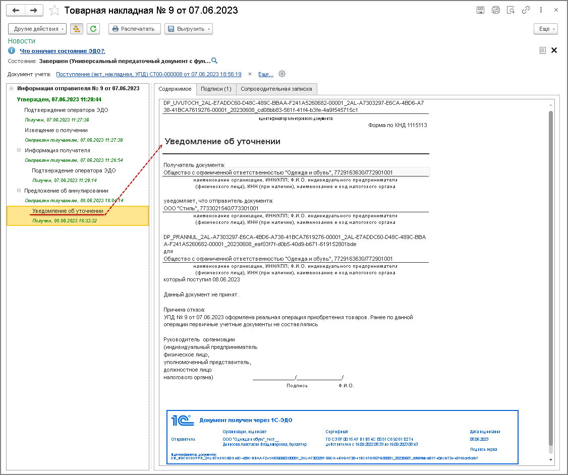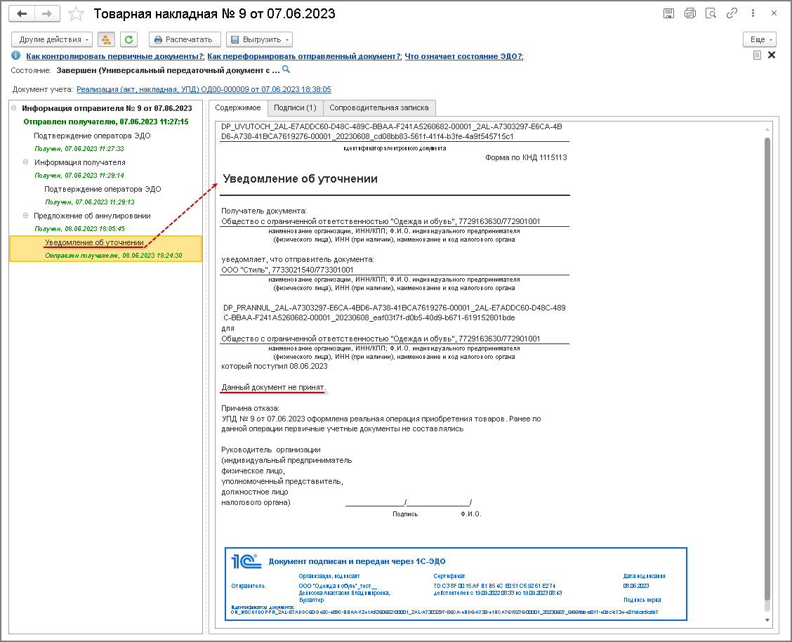Если продавец предложение об аннулировании отклонил, то в адрес покупателя он направит сформированное и подписанное "Уведомление об уточнении".