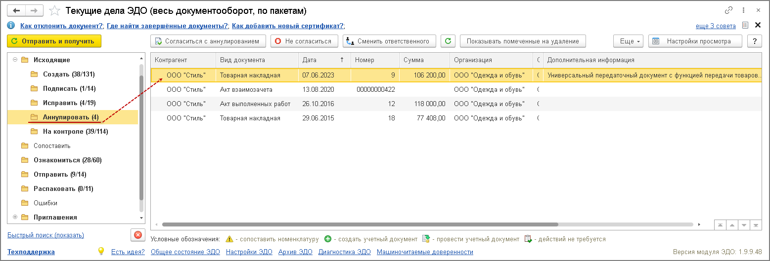 Электронный документ, по которому продавец принял предложение об аннулировании, будет удален из папки "На контроле" списка входящих формы списка "Текущие дела ЭДО".