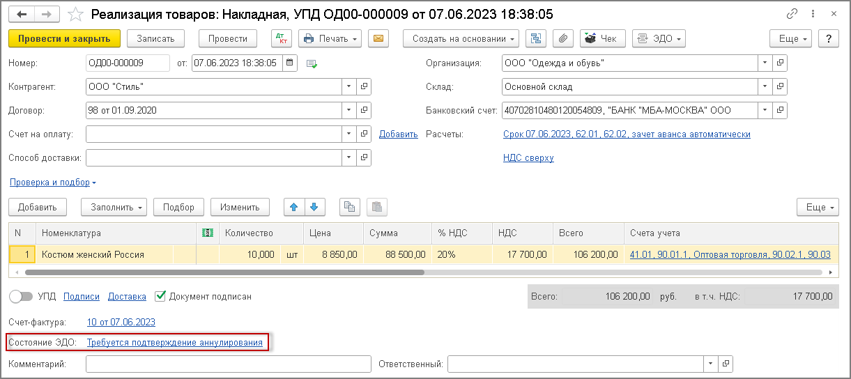 Одновременно информация о том, что поступило предложение об аннулировании электронного первичного документа, отражается в информационной строке "Состояние ЭДО" документа учетной системы "Реализация (акт, накладная, УПД)", на основании которого был сформирован аннулируемый документ, - гиперссылка Требуется подтверждение аннулирования (рис. 11).