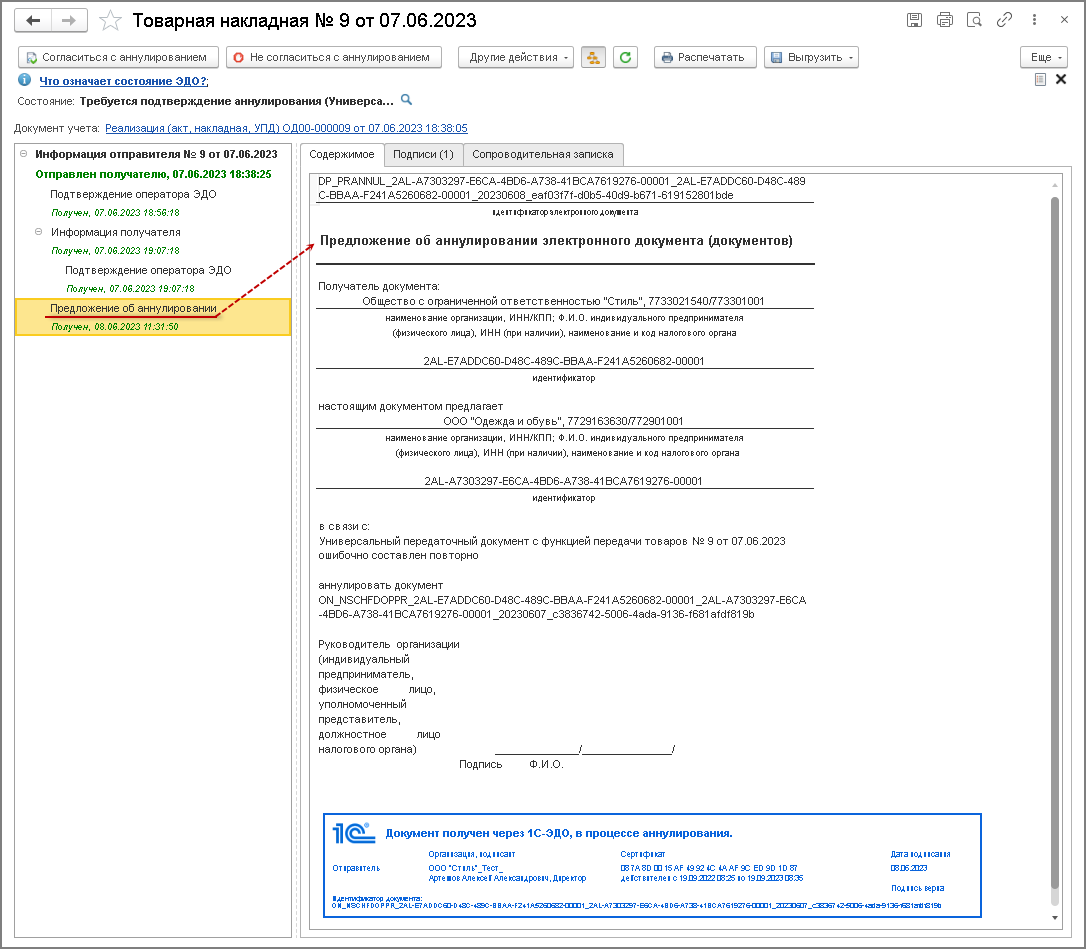 Действия по аннулированию электронного первичного документа на стороне покупателя
