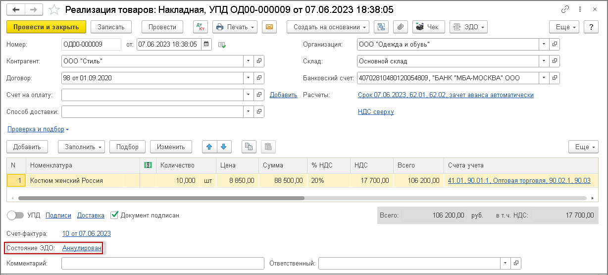 В информационной строке "Состояние ЭДО" документа учетной системы "Реализация (акт, накладная, УПД)" появится гиперссылка Аннулирован (рис. 13).