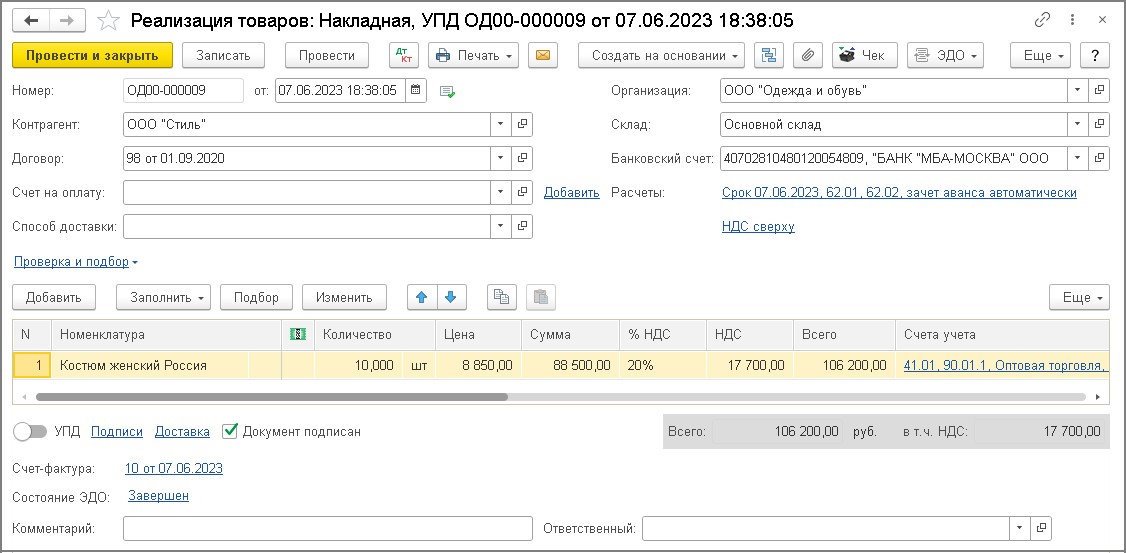 После этого в информационной строке "Состояние ЭДО" документа "Реализация (акт, накладная, УПД)" будет отражена гиперссылка Завершен, которая свидетельствует о возвращении электронного обмена в состояние, предшествующее процессу аннулирования (рис. 17).