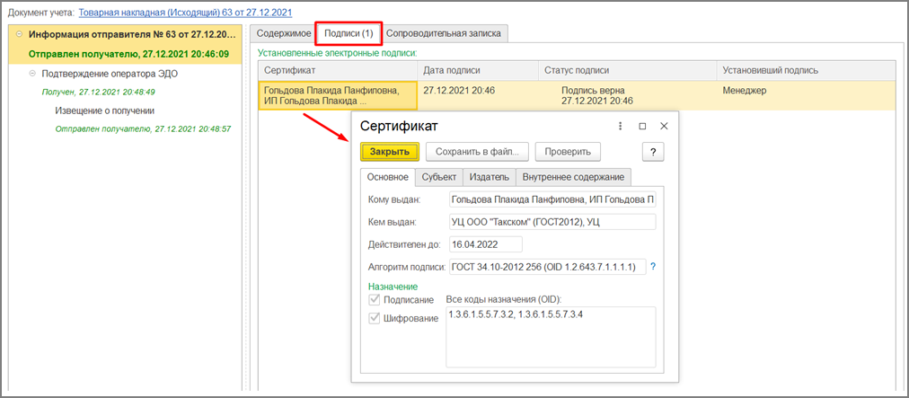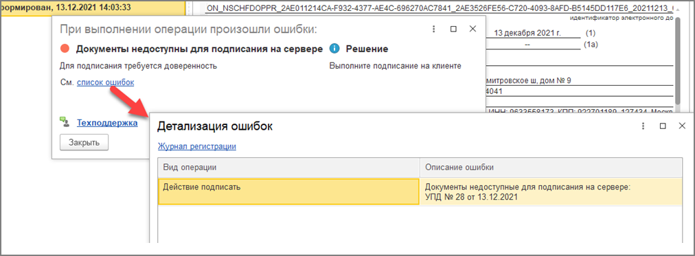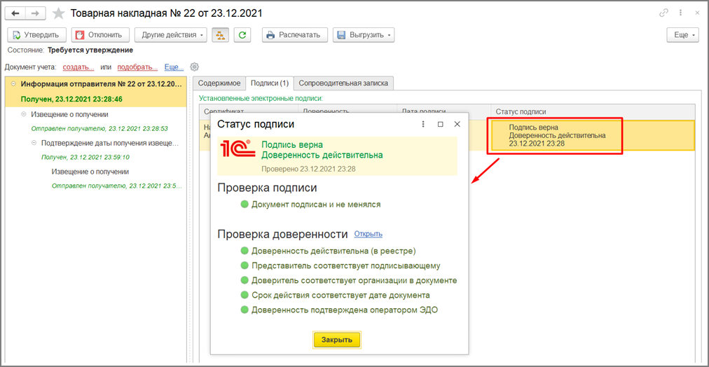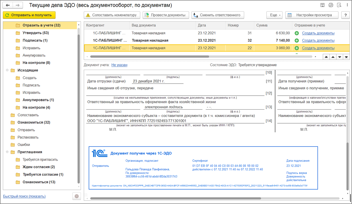 При получении документов автоматически выполняется проверка подписи. Если документ подписан подписью физического лица, которая не содержит ИНН организации, то программа считает, что документ должен быть подписан с указанием доверенности. Далее ищет доверенность в сведениях ЭДО, если не находит – выдает предупреждение. Если находит, то загружает доверенность из распределенного реестра в программу и выполняет следующие действия: