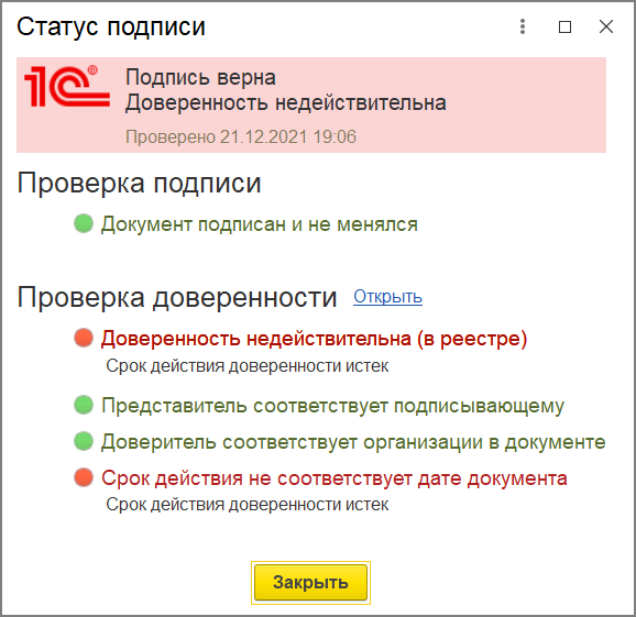 При получении документов выполняется автоматическая проверка подписей и запрашивается актуальная версия машиночитаемой доверенности из распределенного реестра. Если доверенность была отозвана, то программа отобразит этот факт в результатах проверки, и подпись не будет считаться действительной.