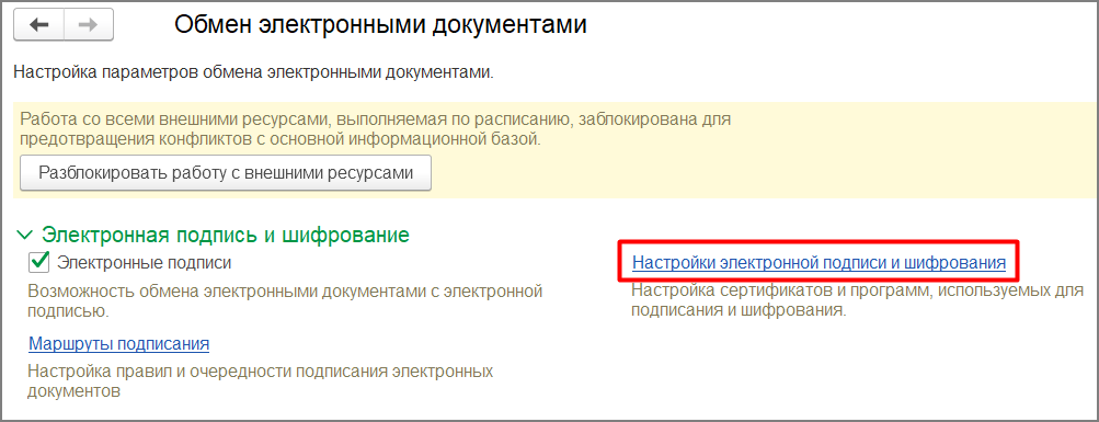 В данный момент работа с МЧД поддерживается только для подписания документов на клиенте. Использование МЧД при подписании на сервере пока не предусмотрено, и программа будет выдавать ошибку. Проверить настройку подписания можно в разделе Администрирование - Обмен электронными документами - Настройки электронной подписи и шифрования (рис. 14).