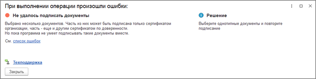 Помимо этого, не предусмотрено подписание пакета документов, в котором одновременно содержатся документы, которые можно подписывать по доверенности и нельзя. Программа в таком случае будет выдавать предупреждение (рис. 17).