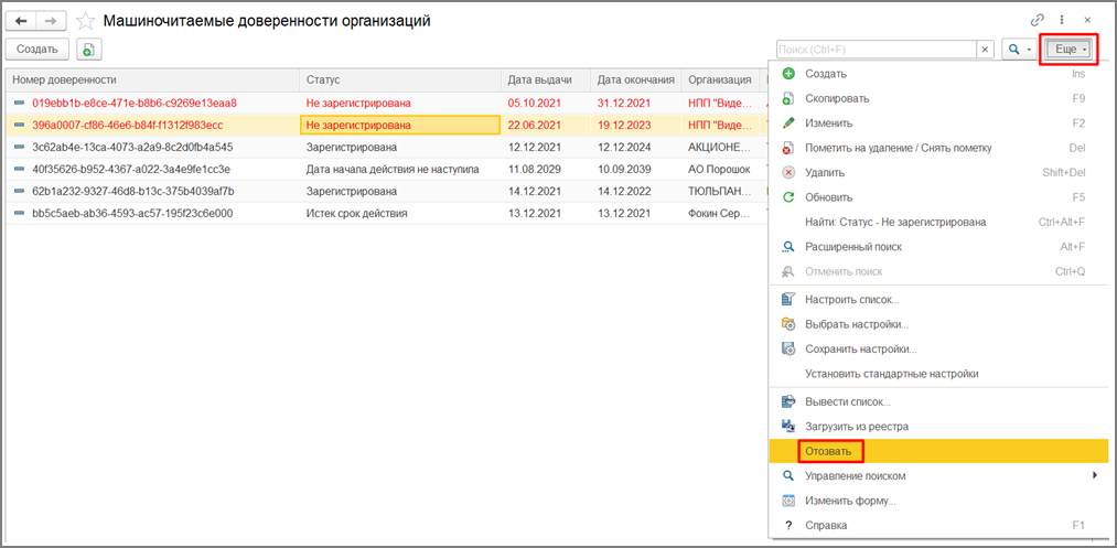 Отозвать доверенность можно в окне списка доверенностей по кнопке Еще – Отозвать (рис. 18).