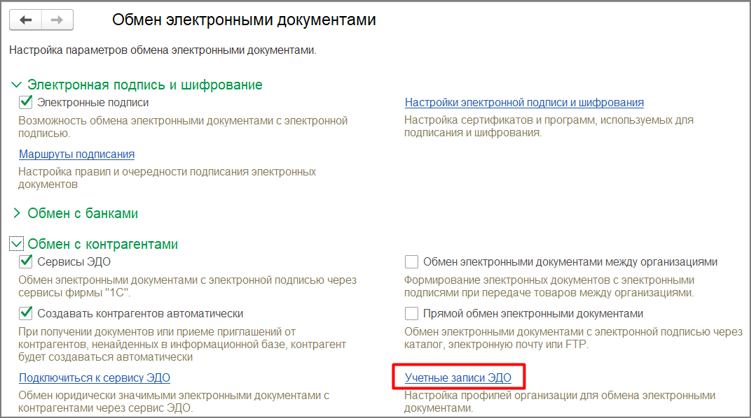 После получения сертификата и оформления доверенности, их следует добавить в учетную запись организации в сервисе 1С-ЭДО. Для этого необходимо открыть список учетных записей в разделе Администрирование – Обмен электронными документами – Учетные записи ЭДО (рис. 7).