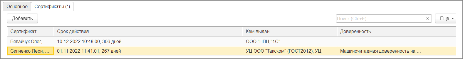 В учетной записи уже есть сертификат организации. Необходимо добавить к нему новый сертификат физического лица по кнопке Добавить (рис. 8).