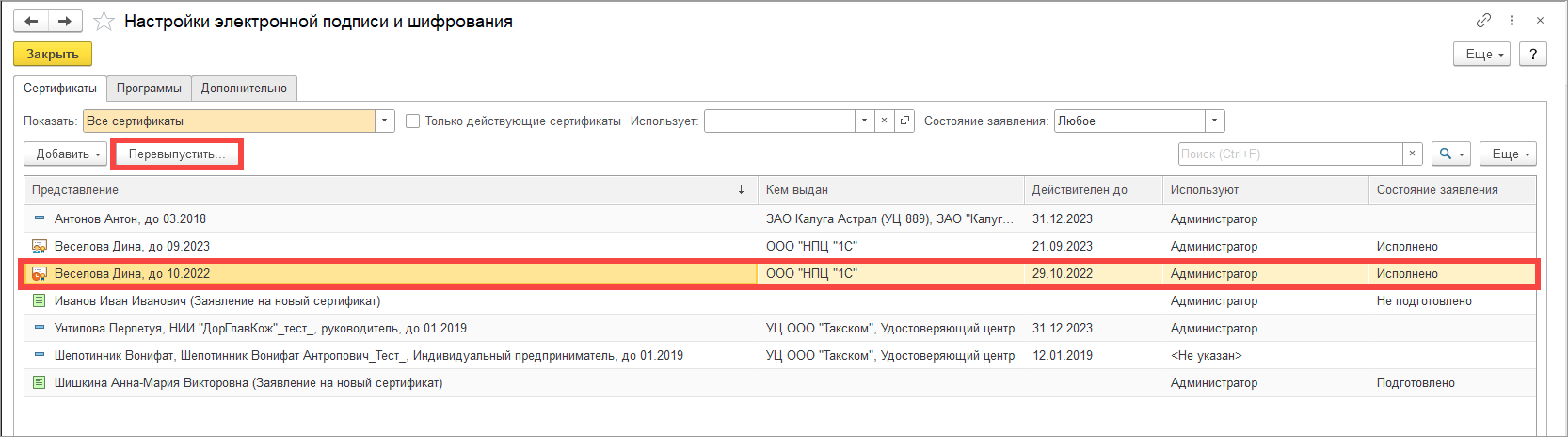 Перейдите в настройки электронной подписи и шифрования. Выберите сертификат, удовлетворяющий условиям продления (помечен пиктограммой с часами). Нажмите кнопку "Перевыпустить…"
