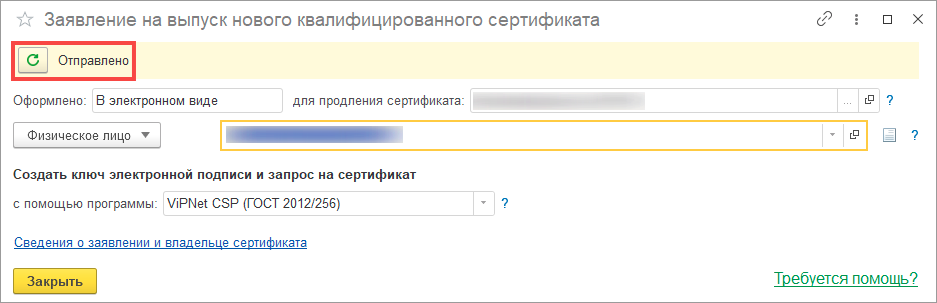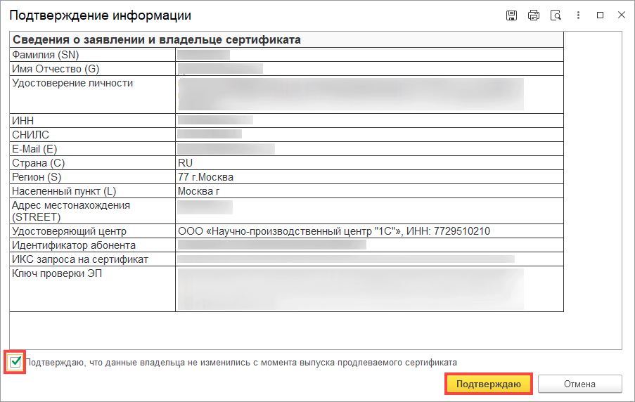 Создайте контейнер закрытого ключа с помощью интерфейса КриптоПро CSP или VipNet CSP. Подтвердите, что данные сертификата не изменились.