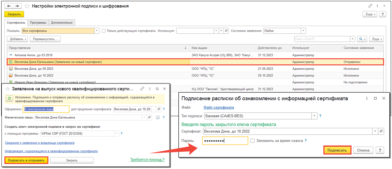 Подпишите расписку об ознакомлении с информацией, содержащейся в новом квалифицированном сертификате.