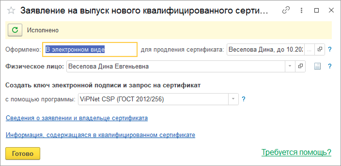 После подписания расписки новый сертификат готов к работе. Нажмите кнопку "Готово".