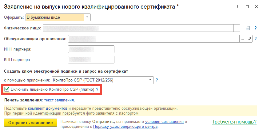 Для заказа лицензии необходимо в заявлении на изготовление 1С:Подпись установить флажок «Включить лицензию КриптоПро CSP (платно)»