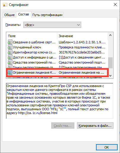 Наличие встроенной лицензии можно проверить на вкладке состав сертификата в поле «Ограниченная лицензия КРИПТО-ПРО»
