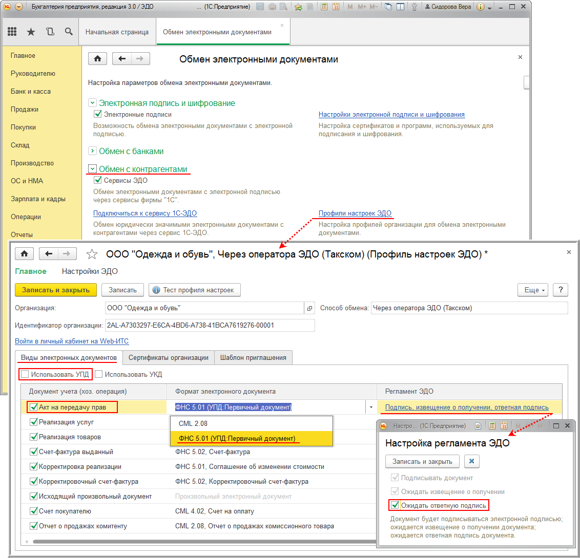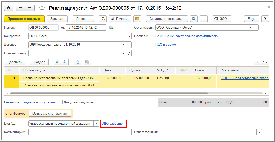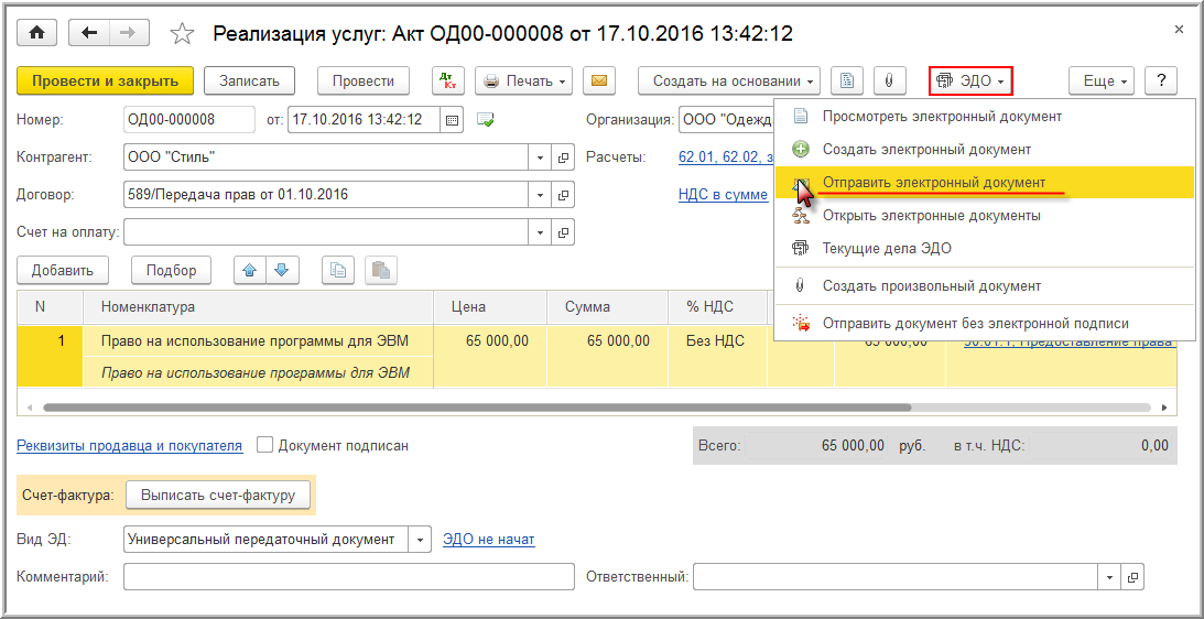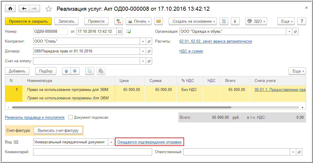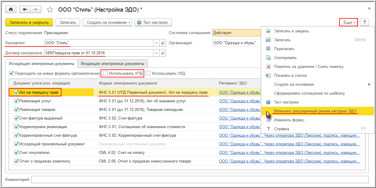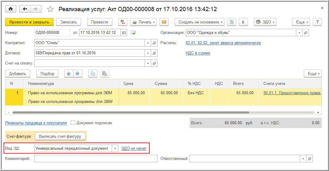 Если организация ООО "Одежда и обувь" по согласованию с контрагентом ООО "Стиль" в качестве первичного документа применяет электронный УПД (утв. приказом ФНС России от 24.03.2016 № ММВ-7-15/155@), то для оформления операции передачи прав на использование программы для ЭВМ, освобожденной от налогообложения НДС согласно пп. 26 п. 2 ст. 149 НК РФ, ей необходимо выполнить следующие настройки.