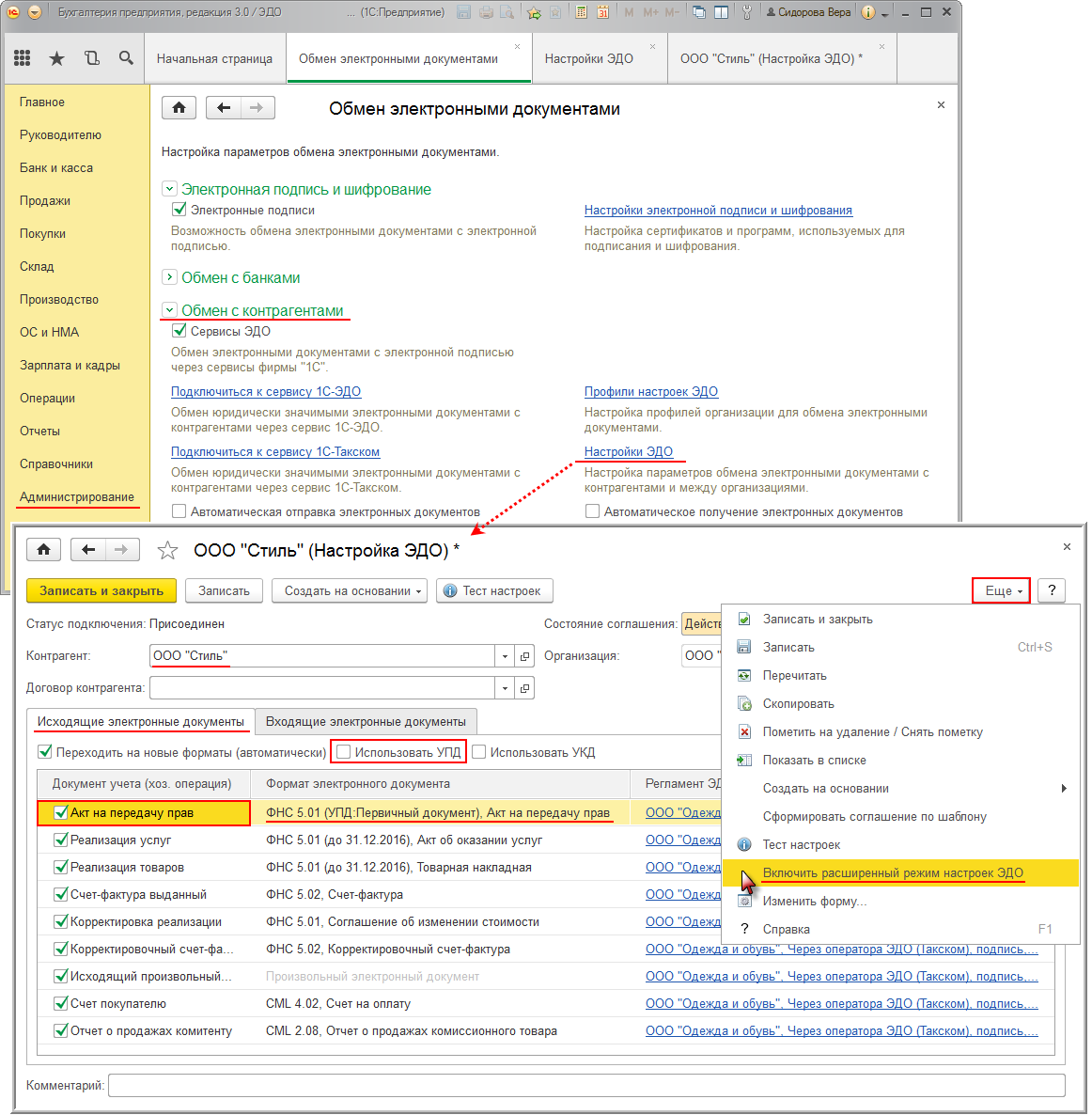 - перейти в расширенный режим настройки, выполнив команду Включить расширенный режим настройки ЭДО из списка доступных команд, открываемого по кнопке Еще;
