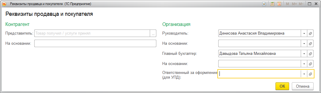 - в поле "Ответственный за оформление (для УПД)" можно внести сведения о лице, ответственном за оформление факта хозяйственной жизни со стороны продавца (лицензиара). Однако, в настоящий момент заполнять эти сведения не целесообразно, так как программа автоматически укажет в качестве ответственного то лицо, которое будет подписывать этот электронный УПД по квалифицированному сертификату ключа проверки электронной подписи.