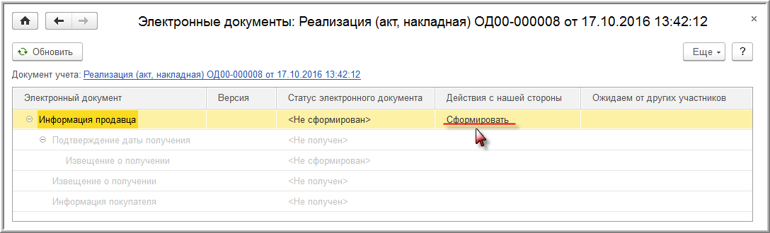 Сформировать электронный УПД также можно с помощью команды Сформировать из формы "Электронные документы" (Таблицы состояния) (рис. 7), которая открывается по гиперссылке строки стояния электронного обмена или по команде Открыть электронные документы из списка команд, открываемого по кнопке ЭДО (рис. 6).