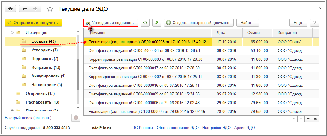 Формирование электронного УПД также можно выполнить из списка документов "Текущие дела ЭДО" (раздел Администрирование - подраздел Сервис или раздел Руководителю - подраздел Сервис, или раздел Продажи - подраздел Сервис), выбрав соответствующий документ "Реализация (акт, накладная)" из папки "Создать" и выполнив команду Утвердить и подписать (рис. 8).